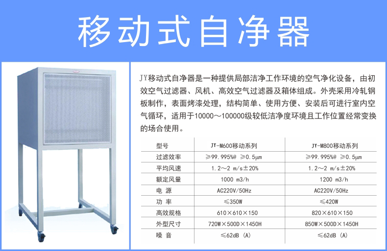 JY移動式自凈器是一種提供局部潔凈工作環(huán)境的空氣凈化設(shè)備,由初效空氣過濾器、風(fēng)機、高效空氣過濾器及箱體組成。外殼采用冷軋鋼板制作,表面烤漆處理,結(jié)構(gòu)簡單、使用方便、安裝后可進(jìn)行室內(nèi)空氣循環(huán),適用于10000~100000級較低潔凈度環(huán)境且工作位置經(jīng)常變換的場合使用。